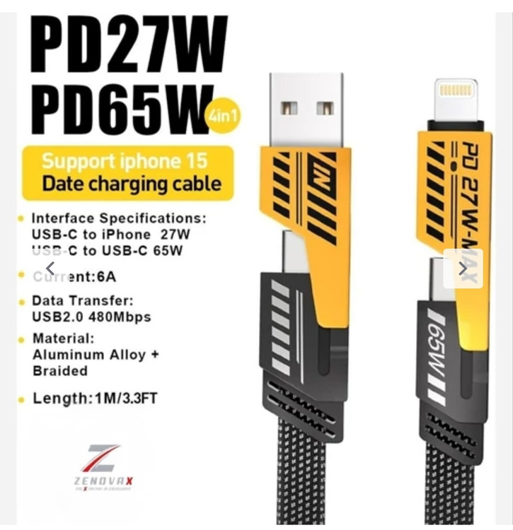 کابل شارژ چهار کاره سر فلزی کنفی (فست شارژ 65 وات) سر سوکت نارنجی،به طول 1 متر