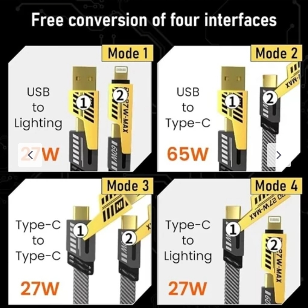 🔥این کابل چهار کاره از جمله کابل های مبدل با کیفیت در بازار است که به دلیل امکانات و ویژگیهای پر تعداد خود مورد استقبال خریداران قرار میگیرد.این کابل یک محصول با قابلیت های فوق العاده و همچنین کیفیت فوق العاده می باشد.شما می توانید از این کابل در 4 حالت استفاده نمایید.از این کابل می توانید برای شارژ انواع موبایل،تبلت و لپتاپ استفاده نمایید.