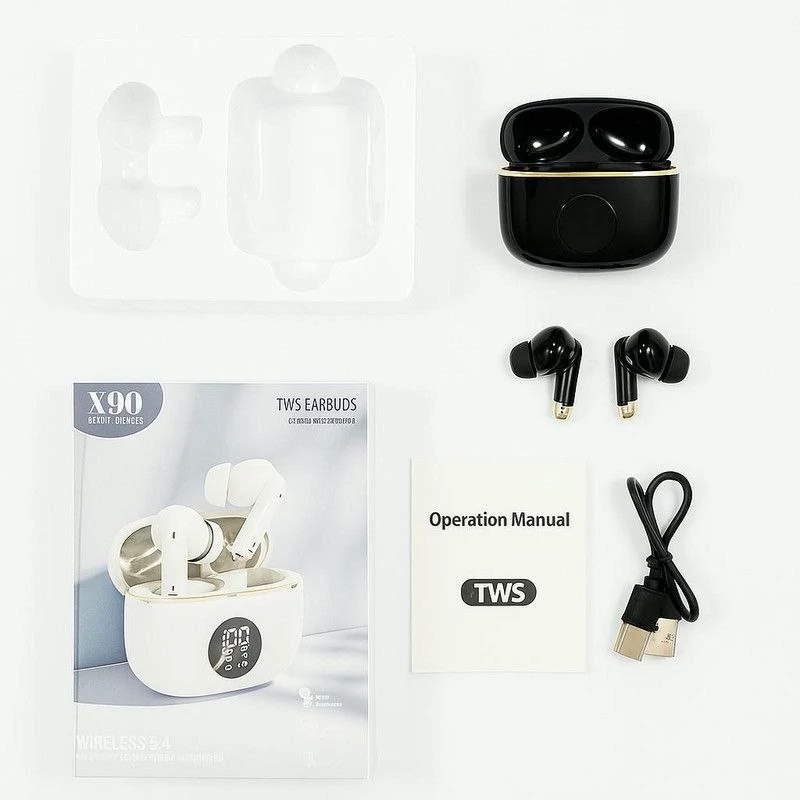 هدفون بلوتوثی X90 با نمایشگر LED، استریو با کنترل لمسی. با صدای استریو همه جانبه اثر صدای ظریف و باکیفیت طول عمر باطری طولانی که طول عمر باطری به 8 ساعت میرسد و همچنین طول عمر محفظه باتری 25 ساعت می باشد و از نمایشگر دیجیتالی پشتیبانی می کند که در هر زمان سطح باطری را بررسی می کند. مشخصات نوع هدفون، هدست و هندزفری تو گوشی (Earbud/Earphone) اقلام همراه هدفون، هندزفری و هدست کابل شارژ قابلیت نویز کنسلینگ نویز کنسلینگ فعال (ANC) ویژگیهای خاص نشانگر LED نمایشگر روی محفظه شارژ پشتیبانی از فرمان لمسی نوع گوشی دو گوشی قابلیتهای شارژ شارژ با سیم درگاه شارژ USB Type-C ظرفیت باتری 180 میلیآمپرساعت نوع کابل USB Type-C نوع اتصال بیسیم رابطها USB Type-C مناسب برای کاربری عمومی